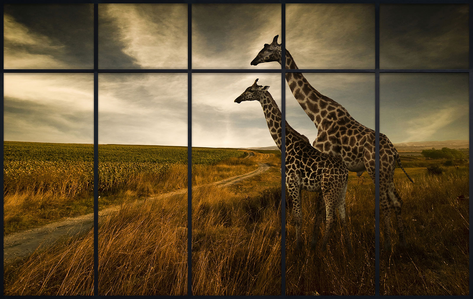 www.lumalea.de > Tapeten > Panoramische Tapeten > Tapeten 3D-Effekt > Glaswände 3D-Effekt > Fototapeten 3D Optische Täuschung - Giraffen
