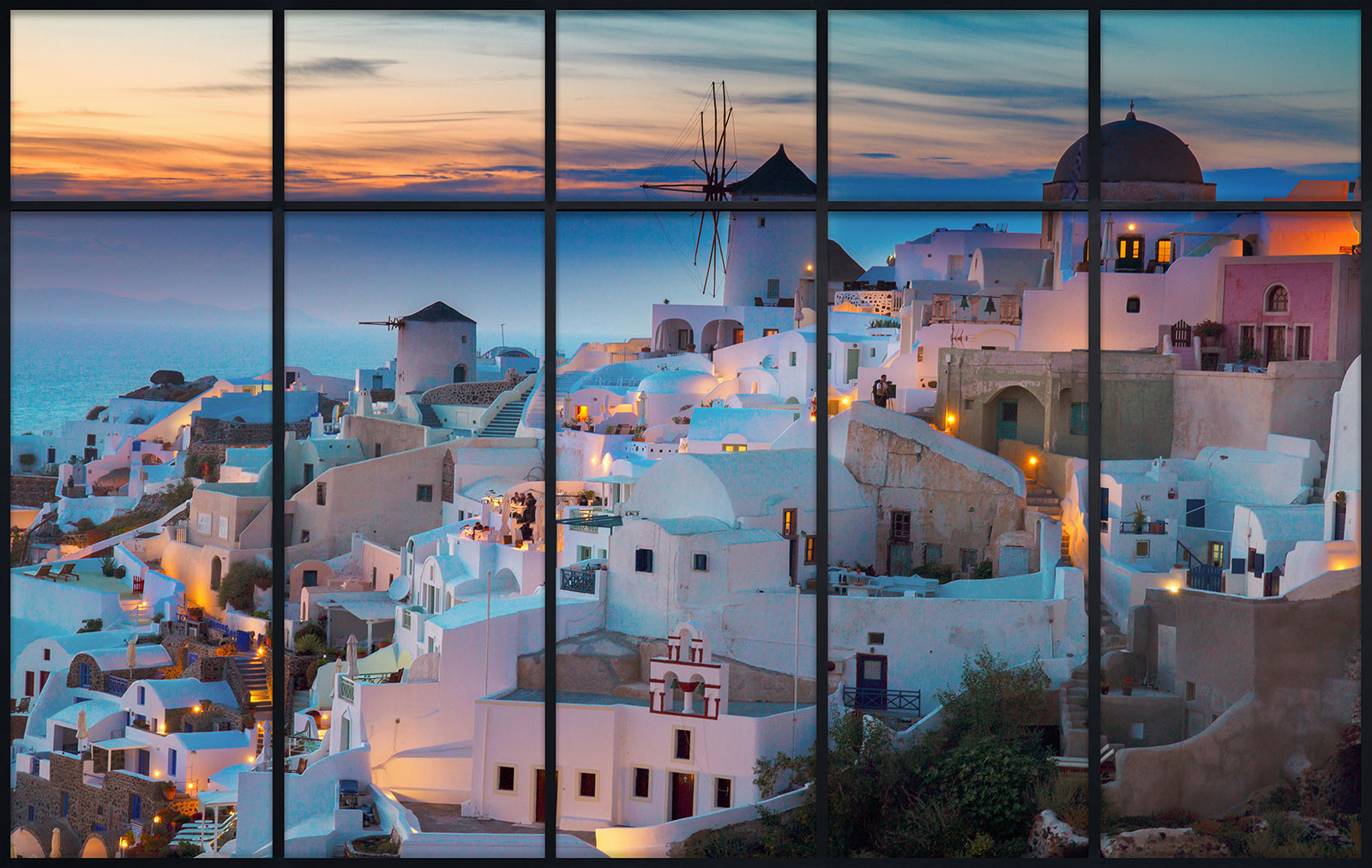 www.lumalea.de > Tapeten > Panoramische Tapeten > Tapeten 3D-Effekt > Glaswände 3D-Effekt > Fototapeten 3D Optische Täuschung - Santorin