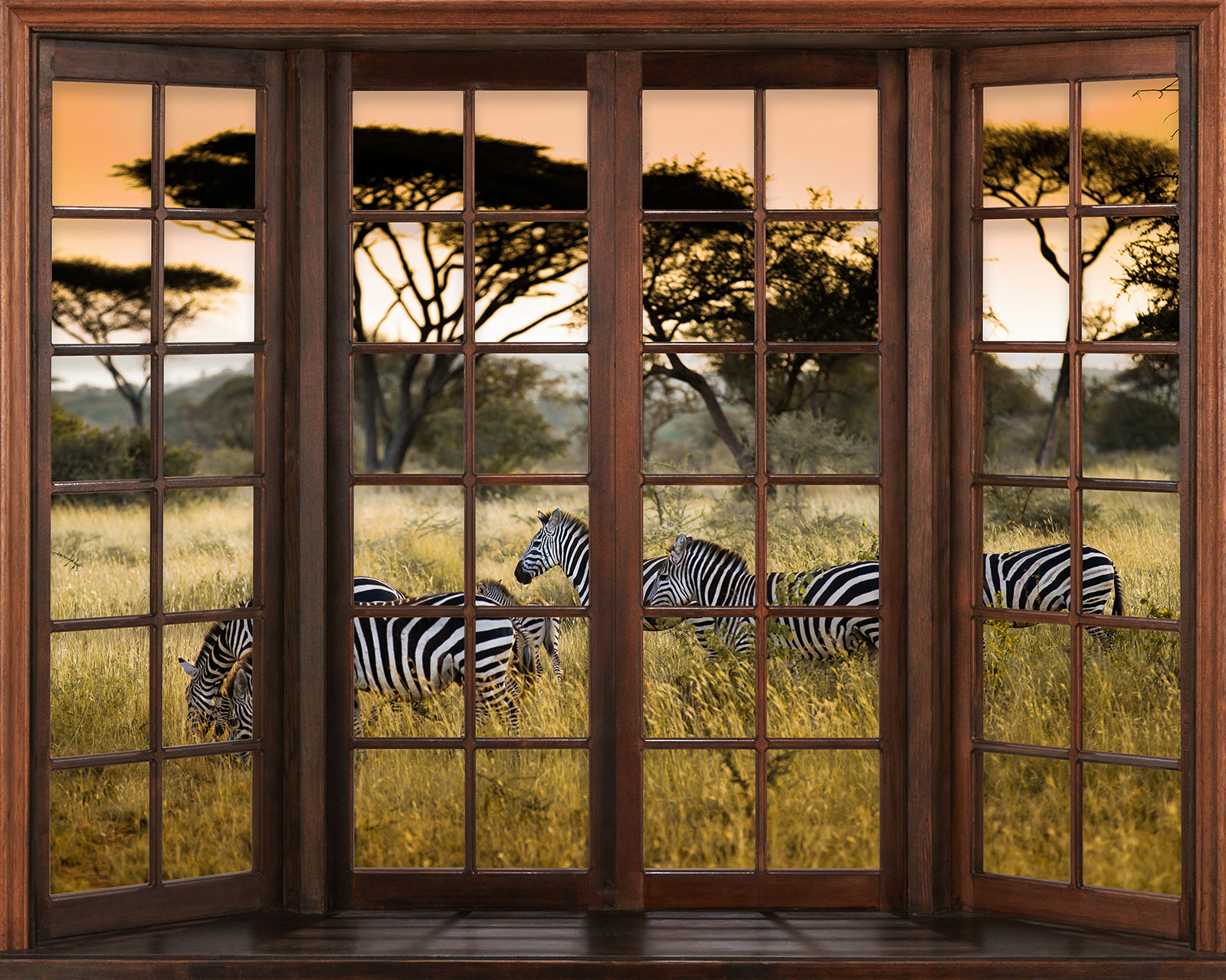 www.lumalea.de > Tapeten > Panoramische Tapeten > Tapeten 3D-Effekt > Fenster 3D-Effekt > Fototapeten 3D Optische Täuschung - Zebras