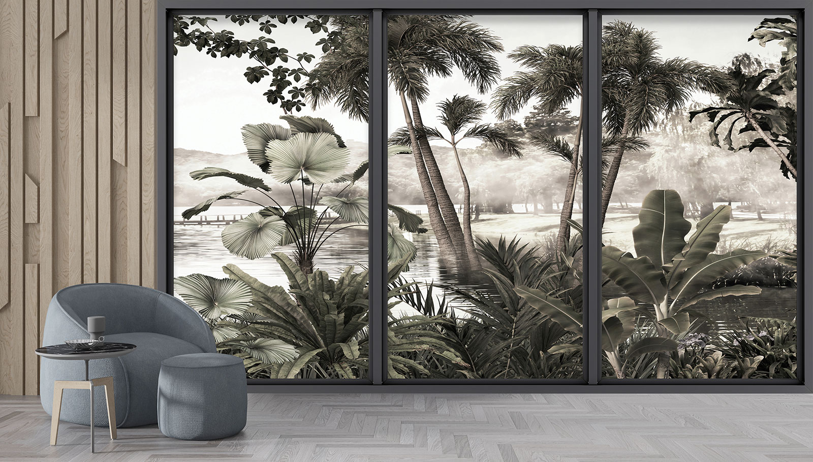 www.lumalea.de > Tapeten > Panoramische Tapeten > Tapeten 3D-Effekt > Fensterfronten 3D-Effekt > Fototapeten 3D Optische Täuschung - Dschungel