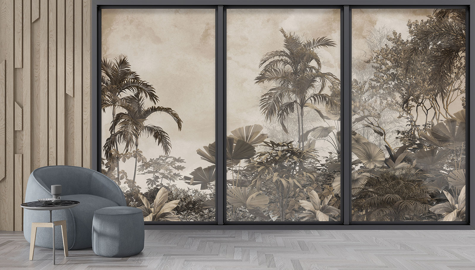 www.lumalea.de > Tapeten > Panoramische Tapeten > Tapeten 3D-Effekt > Fensterfronten 3D-Effekt > Fototapeten 3D Optische Täuschung - Dschungel