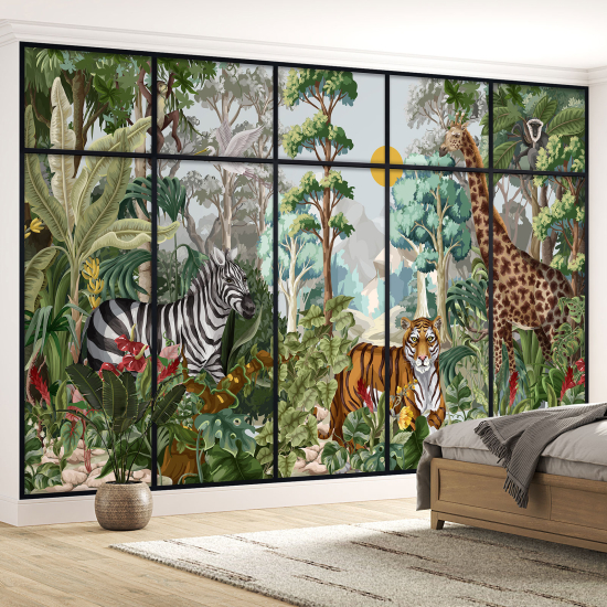 www.lumalea.de > Tapeten > Panoramische Tapeten > Tapeten 3D-Effekt > Glaswände 3D-Effekt > Fototapeten 3D Optische Täuschung für Kinderzimmer - Tiere des Dschungels