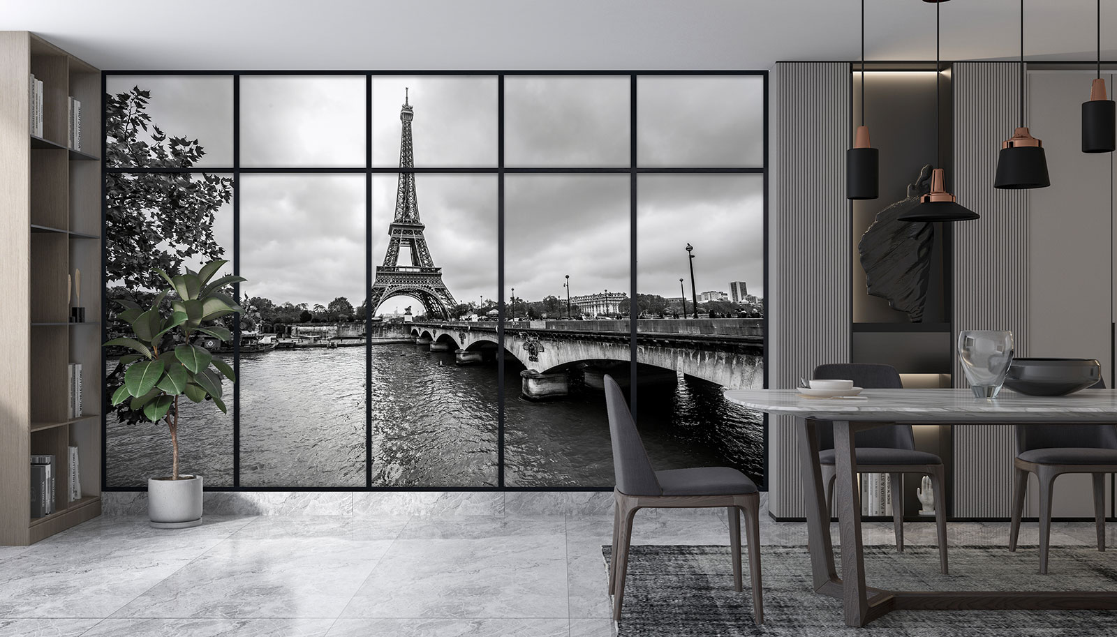 www.lumalea.de > Tapeten > Panoramische Tapeten > Tapeten 3D-Effekt > Glaswände 3D-Effekt > Fototapeten 3D Optische Täuschung - Paris Eiffelturm
