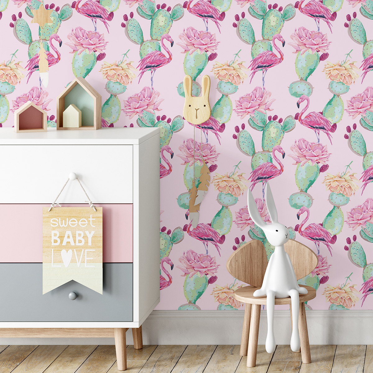 Kindertapete - Kaktus Rosa Flamingos
